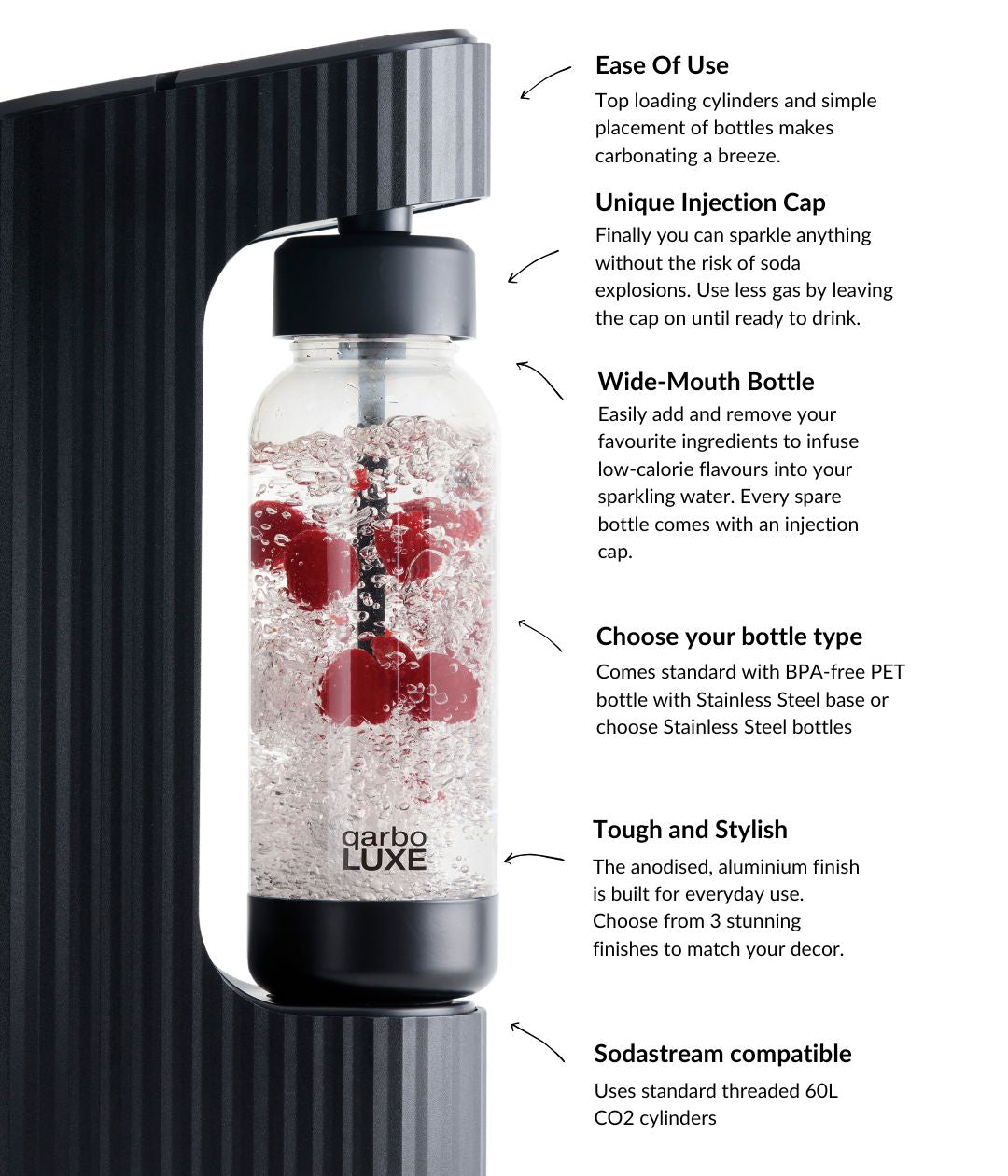 The qarbo LUXE brings a refreshing upgrade to the home carbonator because it's designed to bring health, flavor, and sparkling fun to your home. Where most carbonators only let you sparkle water, the qarbo LUXE encourages you to add fresh ingredients to the bottle. You will be amazed by the delicious and healthy sparkling drinks you can create just by adding some simply, fresh ingredients.Â